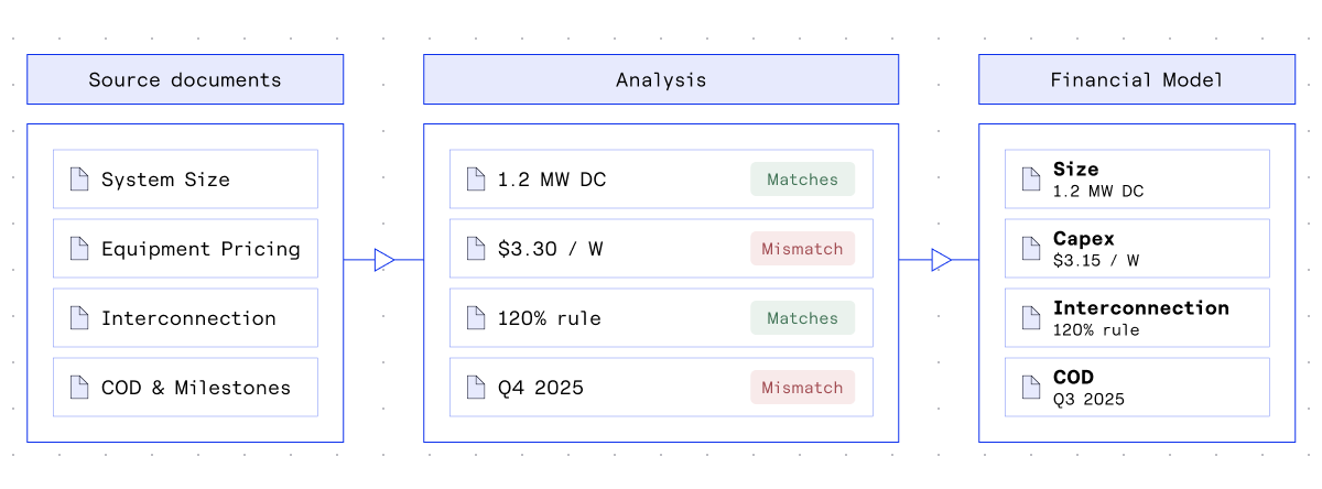 Catching errors and inconsistencies at this stage — before they flow into underwriting, deal terms, or funding decisions — is where diligence creates the most value. Without this step, model assumptions can drift from project reality, and the gap often isn't caught until it affects investment outcomes.