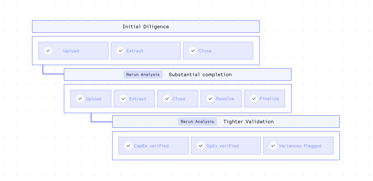 When a project reaches substantial completion (SC), Euclid reruns the diligence workflow with a tighter focus on validating development-stage assumptions against real, as-built data. Instead of relying on estimates, Euclid verifies whether the model's key drivers — especially CapEx and OpEx — are now supported by actual invoices, contracts, and operating documentation.